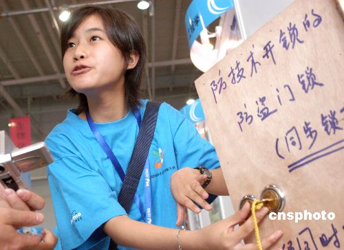 遼寧本溪二十六中的女生關麗,周末在北京舉辦的“第二十屆全國青少年科技創新大賽”上,興奮地向觀眾展示自己獨創的防盜門鎖。關麗防盜門鎖是采用了兩個以齒輪內部連接的鎖芯,當“鎖王”以技術手段撥動一個鎖芯時,卻帶動不了另一個鎖芯,因此保險系數大大增加。作者:鄒憲