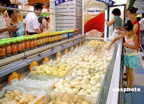 8月7日,中國食品科學技術學會專家委員會委員、天津商學院食品工程系教授張坤生近日指出,散裝速凍食品存在明顯的安全隱患。散裝銷售,無論是在銷售人員拆除大包裝散賣時,還是顧客挑選過程中,都不可避免人與食品的接觸,造成細菌污染;而散裝食品與空氣接觸面積大,還會造成水分蒸發、產品干裂與油脂的氧化、酸敗等現象,同時空氣中存在的微生物、病毒等很可能污染食物,導致食用不安全。圖為顧客在超市選購散裝速凍食品。作者:張和平