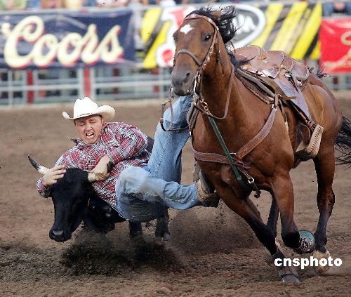 火爆激烈的牛仔競技大賽日前在美國堪薩斯州道奇城開幕。圖為8月5日,,來自俄克拉荷馬州的牛仔正在參加摜牛比賽。道奇城是美國著名的“牛仔城”,以其濃郁的西部風情和牛仔文化著稱于世。作者:Ic/cnsphoto