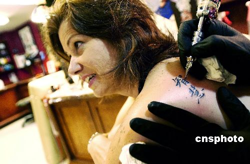 正在功讀心理學(xué)博士的美國人帕特麗夏女士八月將迎來四十四歲生日,她送自己一個(gè)獨(dú)具風(fēng)格的生日禮物——用漢字“智慧”兩字紋身。紋身在美國多元文化中非常普遍,許多人選擇漢語的詞或字符紋身,是因?yàn)闈h字的藝術(shù)可觀性并且充滿東方神秘感。美國的許多著名演員和歌手都紋身刺字,以此推廣為大眾化藝術(shù)。作者:陳鋼
