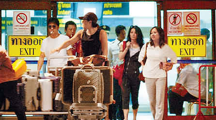 現場所見,王菲邊走邊把墨鏡移到頭上,神情疲累,一步出機場大門已急不及待煲煙提神,至于表情輕松的李亞鵬則全程戴上太陽眼鏡,同樣點起香煙抽起來,然后二人便站在街上等候尾隨友人推出行李車,其間王菲難掩倦意,頻頻打呵欠。眾人其后登上早已在場等候的車子,行李則存放在另一小型貨車上,一切打點妥當后,司機便駕車直駛Banyan Tree五星級酒店。