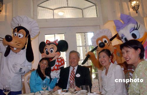 香港迪斯尼樂園市務及銷售副總裁陳敬考(中)9日表示,樂園內有兩間酒店,房間預訂情況理想,其中在一些特別日子,例如中秋節,房間預訂已超過五成。作者:譚達明