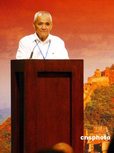 8月11日,紀念中國抗日戰爭暨世界反法西斯戰爭勝利六十周年午餐聚會在香港君悅酒店舉行,來自內地和香港的數十位抗戰老戰士相聚一堂,出席紀念活動。圖為81歲的燕秀峰上臺演講,秀峰老人是抗戰電影《小兵張嘎》的原型人物。作者:潭達明