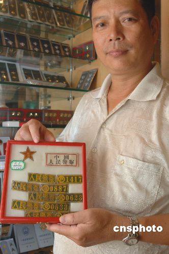 八月十三日,在福州鐵路公安工作二十幾年的揚(yáng)先生在家里展示收藏的第一代中國人民警察的警銜。楊先生是一位軍銜、警銜的收藏愛好者,至今已經(jīng)收藏有各類軍銜、警銜上千枚,不少都是收藏界的精品。作者:王東明