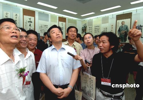 為紀念抗日戰爭勝利六十周年、推動祖國和平統一大業,以“兩岸攜手,同紀抗戰;共建和諧,共謀發展”為主題的《紀念抗日戰爭勝利六十周年名人名家書畫邀請展》,八月十四日在福州畫院隆重開展。本次展覽共展出十七個省市地區作品一百八十多件并專門設立臺灣展區。圖為中共福建省委書記盧展工(圖中)等各界人士出席開展式并觀展。作者:劉可耕