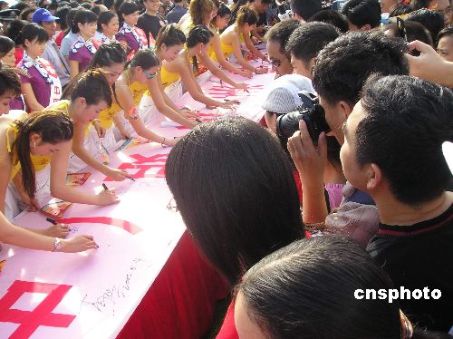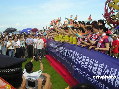 8月14日,2005年亞洲小姐(中國賽區(qū))進(jìn)入總決賽的20名候選佳麗來到廣東湛江,傾情支持該市湖光巖申報(bào)世界地質(zhì)公園。作者:馬燦