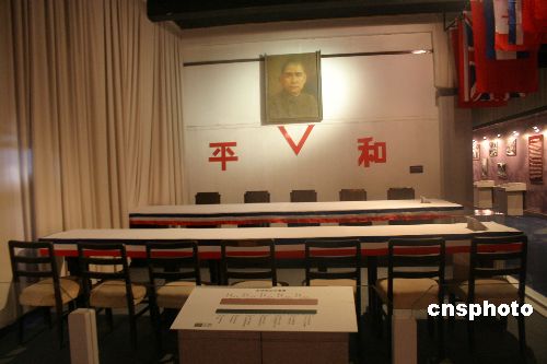 以六十年前日軍中國戰區投降儀式的真實文物組成的歷史場景,8月15日在南京博物院正式展出。這次展出的中國戰區日軍投降簽字儀式的文物有:兩張長條桌、背景墻上掛著孫中山像、會場的掛鐘、當時中國代表何應欽和日本代表岡村寧次使用的毛筆和硯臺等文具等均為真實文物。作者:陳光明