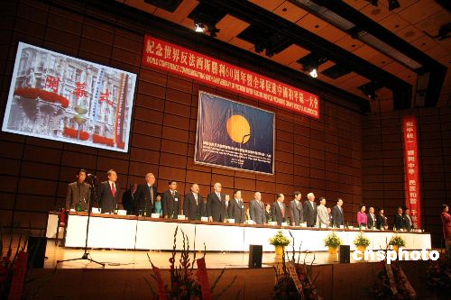 “紀(jì)念世界反法西斯戰(zhàn)爭勝利60周年暨全球促進(jìn)中國和平統(tǒng)一大會”15日在歐洲名城維也納的聯(lián)合國ACV會場隆重開幕。圖為開幕式上各界代表高歌“我的中國心”。作者:鐘誠