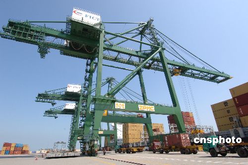 福州港江陰港區二號、三號兩個五萬噸泊位開始動工(沉箱)建設,計劃二○○七年三月完工,同時四號、五號泊位也在擬建中。四個泊位建成后,江陰港區將成為擁有五個五萬噸級泊位,可兼靠第六代集裝箱船的大型樞紐港。圖為已經建成的1號泊位已投入使用。作者:王東明