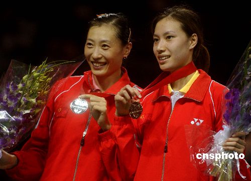 羽毛球世錦賽女單決賽二十一日在美國(guó)阿納海姆舉行,世界排名第二的中國(guó)選手謝杏芳(右)挑戰(zhàn)衛(wèi)冕冠軍的頭號(hào)種子選手張寧(左)獲得成功,摘到女單桂冠。作者:賈國(guó)榮