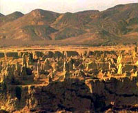 交河故城位于吐魯番市以西約13公里的雅爾乃孜溝中。它最早是西域三十六國之一的“車師前國”的都城。《漢書·西域傳》稱:“車師前國,王治交河城,河水分流繞城下,故號交河城!惫食墙ㄓ谝粋自北向南,高30余米的黃土地上,長165O米,最寬處300余米。四無城墻,崖岸筆立如削,壁壘天然。