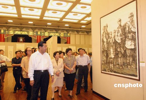 圖:賈慶林、何魯麗參觀“紀念抗戰(zhàn)勝利60周年美術(shù)作品展”