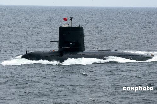 “和平使命-2005”中俄聯合軍事演習第三階段8月23日在中國山東半島及其附近海域開始,圖為中國潛艇駛過觀摩艦接受聯合導演部檢閱。作者:王麗南