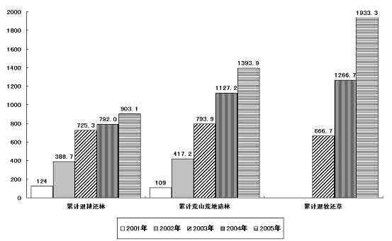 “三河三湖”、三峽庫區、南水北調工程沿線等重點流域區域水污染防治工作步伐加快,城鎮污水、工業廢水、危險廢物、火電廠二氧化硫污染治理進一步加強。城市污水處理率和工業固體廢物綜合利用率繼續提高。部分空氣污染嚴重城市的空氣質量有所改善。退耕還林完成111.1萬公頃,荒山荒地造林及封山育林266.7萬公頃,退牧還草666.7萬公頃。天然林資源保護、京津風沙源治理等重點生態建設工程進展順利。“三化”草地治理、水土流失治理和礦山生態恢復面積分別為838萬公頃、420萬公頃和7.2萬公頃。野生動植物資源保護得到加強。