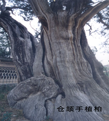 “倉頡手植柏”是廟內最古老的柏樹。此柏腰圍7.28米,根圍9.3米,高17米,林業專家斷定它足有五千年樹齡。它完全可以同“黃帝手植柏”相媲美。相傳當年倉頡選中這個墓穴后,便在此處栽植了這棵柏樹,所以叫“倉頡手植柏”。