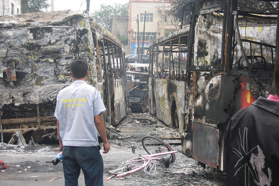 7月6日,烏魯木齊市一位市民注目被犯罪分子焚燒的汽車。在7月5日晚發生的嚴重暴力犯罪事件中,被毀車輛達260部。 中新社發 鐘新 攝