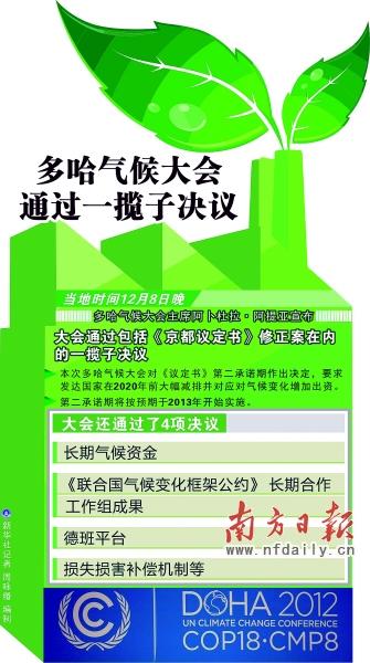 經(jīng)過一天一夜的“加時”鏖戰(zhàn),多哈氣候大會終于在當(dāng)?shù)貢r間8日晚上通過一攬子決議,戲劇般地落下帷幕。會議決定從2013年開啟《京都議定書》第二承諾期,為期8年。此外,會議還決定到2015年時達(dá)成一個涉及所有國家的有關(guān)2020年后全球應(yīng)對氣候變化行動的協(xié)議,并重申發(fā)達(dá)國家應(yīng)當(dāng)為發(fā)展中國家應(yīng)對氣候變化提供資金支持。