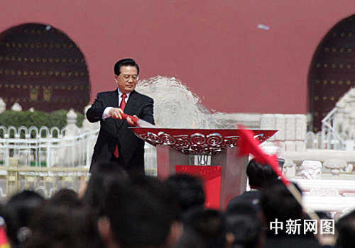 3月31日,北京奧運會圣火歡迎儀式暨傳遞啟動儀式在北京天安門廣場啟動。圖為胡錦濤主席在眾人的注視下,用火炬點燃圣火盆。中新社發 張宇 攝