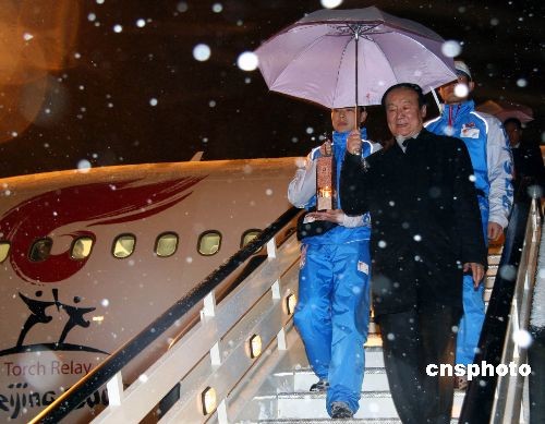巴黎時間六日晚十一時四十五分(北京時間七日凌晨五時四十五分),北京奧運圣火傳遞“和諧之旅”抵達第五站“浪漫之都”法國巴黎,中國駐法大使孔泉和法國體育官員到瑞雪紛飛的機場迎接。圖為北京奧組委副主席蔣效愚等護送北京奧運圣火走下專機。