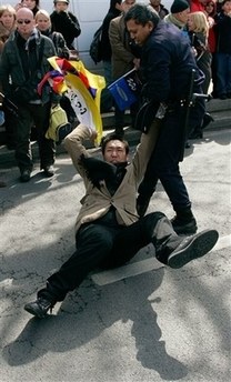 巴黎警方表示,北京奧運火炬從艾菲爾鐵塔出來沿著塞納河傳遞了大約兩百米時受到現場破壞分子的阻撓,火炬兩次被送上安全大巴。