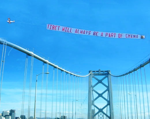 華人華僑還為這次傳遞活動租用了兩架直升飛機,盤旋在沿途的上空。一架飛機上用英文拉出橫幅,“TIBET WILL AIWAYS BE A PART OF CHINA(西藏永遠是中國的一部分)”,另外一個橫幅是:“GO BEIJING CHINA!GO OLYMPICS!(歡迎到北京看奧運會)”。
