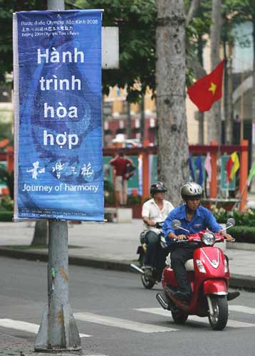 盡管北京奧運圣火還未抵達,但胡志明市為了迎接圣火的到來做好了各種準備。在胡志明市街頭,處處可見懸掛著宣傳北京奧運圣火傳遞活動的彩旗。