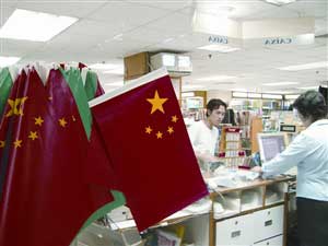 圣火傳遞中大派用場的國旗及區(qū)旗,近期已有居民及社團趕購。星光書店有售的四號懸掛國旗,銷售量增加了兩成。另外,同有售國旗的聯(lián)盈體育用品公司負責人陳太表示,近期國旗銷售量較平時上升了兩成。她說,過去舉行活動,手搖國旗及四號懸掛旗最受歡迎,然而,國旗畢竟不是一般商品,商家不會以純商業(yè)角度去訂價。以手搖小紙旗為例,僅售兩元;至于四號懸掛國旗則賣六十元左右,不會定價過高。