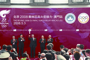 北京奧運(yùn)火炬接力第21站——澳門站的起步儀式,3日下午3時(shí)半在漁人碼頭勵(lì)駿廣場舉行,由行政長官何厚鏵,中聯(lián)辦主任白志健,國際奧委會(huì)主席羅格的代表、國際奧委會(huì)委員、中國奧委會(huì)名譽(yù)主席何振梁,北京奧組委執(zhí)行副主席楊樹安,中國澳門奧委會(huì)主席藍(lán)鏵纓主禮,并為澳門站120位火炬手打氣。