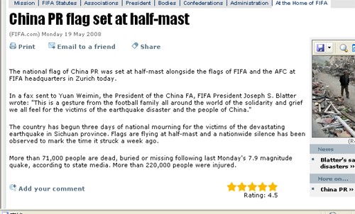 國際足聯(lián)19日在其官方網(wǎng)站發(fā)布了一條消息,稱國際足聯(lián)用下半旗的方式哀悼四川地震的遇難者。讓人有些遺憾的是,國際足聯(lián)主席布拉特在慰問信中,將中國足協(xié)主席的名字錯寫成“袁偉民”,而不是“劉鵬”。