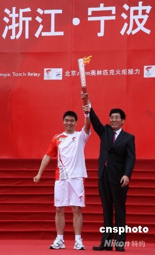 5月22日,舉國哀悼四川汶川大地震遇難同胞三天后,北京奧運圣火在寧波繼續傳遞。圖為第一棒火炬手竺士杰從寧波市委書記巴音朝魯手中接過火炬。 中新社發 周兆軍 攝