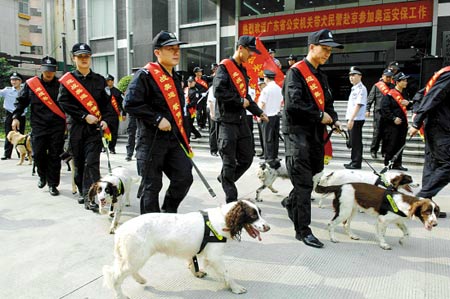 據悉,此次公安部從全國公安系統選調204名帶犬民警、204頭搜爆犬參加奧運安保工作,廣東抽調的數量最多。目前廣東共有16個地級市公安機關建立了警犬機構,擁有警用工作犬769頭,占全國警犬數量的1/6。