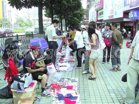 “奧運(yùn)主題T恤15元一件,紅旗4元一對,紅色‘中國心’貼紙2元一版……”近幾日,記者在貴陽市大十字、紫林庵、噴水池、師大等主要路段看到,有不少商家在路邊擺起了地?cái)偅瑠W運(yùn)小商品有T恤、印有“中國加油”的絲帶、黃色五角星的掛飾、小的五星紅旗等,吸引了不少市民駐足購買。一位頭上扎著紅色絲帶,臉上貼著心形臉貼,手中揮舞著小國旗的河南商人告訴記者,“最近幾天生意都不錯,每天都能賣出100多件商品,其中小國旗是最好賣的。”一位正在挑選福娃T恤的韓先生對記者說,他前天已經(jīng)為他們一家3口買了3對國旗,想到奧運(yùn)圣火馬上要來貴陽了,再來買3件“奧運(yùn)T恤”,這樣主要是表達(dá)自己對北京奧運(yùn)會的支持和期盼。