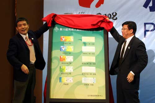 北京奧運票務中心主任朱炎、副主任于喜來揭曉北京殘奧會門票票樣。
