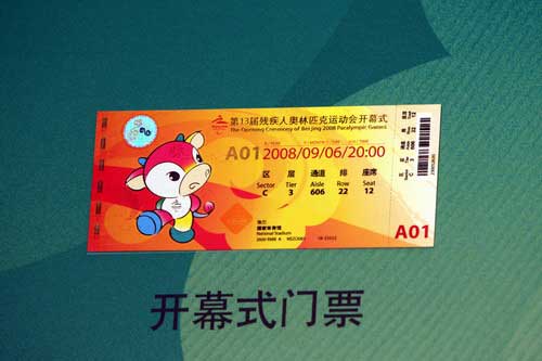 殘奧門票包括殘奧會開幕式門票、閉幕式門票、體育比賽紀念票、熱敏票,大體的方式跟奧運會的類別是一樣的。不過,設計體現(xiàn)殘奧會的精神,開、閉幕式主要圖案是殘奧會的吉祥物,即以“福牛樂樂”為主要的元素。