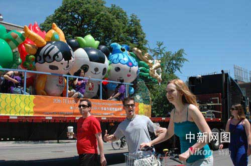 中新網多倫多6月18日電 2008北京奧運吉祥物“五福娃”參加第20屆多倫多國際龍舟節花車巡游,與中國傳統的龍舟共同傳遞來自北京奧運的美好祝福,受到多倫多市民的熱烈歡迎。