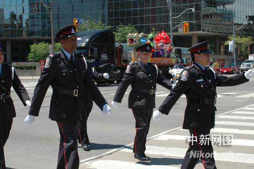 多倫多警察現場為福娃龍舟花車“護航”。(圖片由國家旅游局駐多倫多辦事處提供)