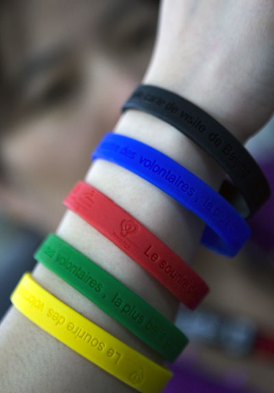 在今天上午的北京奧運會、殘奧會京外、境外賽會志愿者工作會議上,“微笑圈”法文國際版被發布,它由奧運五環顏色組成,外側印有法文“Le sourire des volontaires,la plus belle carte de visite de Beijing”,據悉,該文字翻譯稱中文就是“志愿者的微笑是北京最好的名片”的,內側印有唯一的編號。