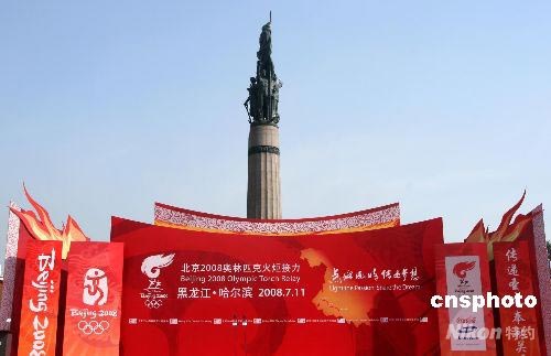 7月11日,北京奧運火炬在哈爾濱傳遞,從防洪紀念塔前起跑。1957年,松花江洪水威脅哈爾濱,全市人民眾志成城戰(zhàn)勝洪水襲擊,并于次年建立此塔以志紀念。 中新社發(fā) 周兆軍 攝