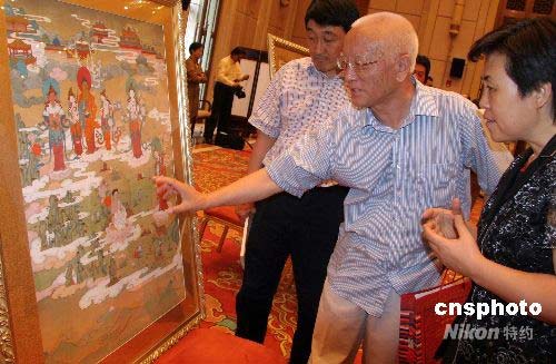 中國社會科學院《格薩爾》研究中心主任、中國《格薩爾》學學會會長降邊嘉措研究員(中)向人們介紹中華民族藏文化藝術珍品的格薩爾唐卡作品。中新社發 孫自法 攝