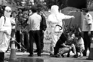 昨天上午,在臨時搭建的電影院里,工作人員模擬恐怖分子,使用一種白色粉末狀不明物質實施了生物恐怖襲擊。北京市反恐辦接到報警,立即通知衛生局,全市衛生系統實時啟動處置生物恐怖襲擊事件應急預案。疾控、急救、傳染病醫院等數支24小時待命的生物反恐應急小分隊接到任務命令。兩分鐘后,隊員攜帶應急處置物資火速趕赴現場,同時,衛生局、疾控中心和衛生監督所負責人分頭趕到現場指揮。