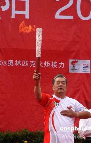 7月17日,北京奧運火炬在沈陽傳遞,第一棒火炬手是“中國奧運第一人”劉長春的次子劉鴻圖。三個月前,他的哥哥劉鴻亮參加了北京奧運火炬在希臘的傳遞活動。劉鴻圖接過第一棒火炬后,手撫胸口閉目默念。他在接受記者采訪時說,他用這種方式告慰先父,由他開啟的中國人的百年奧運夢想終于實現了。中新社發 周兆軍 攝