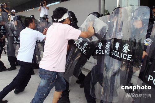 奧運村法庭舉行奧運安保演練。發生“突發事件”時,法警使用盾牌將鬧事“當事人”與遭到圍攻的法官分隔開。中新社發 劉新 攝