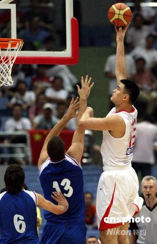 備戰(zhàn)北京奧運(yùn)會的中國男籃,7月17日晚在杭州舉行的2008斯坦科維奇洲際杯籃球賽的首場比賽中以96比72戰(zhàn)勝幾乎全部為年輕選手組成的塞爾維亞隊(duì)。中國隊(duì)的“擎天柱”姚明受重傷143天后首次登場,砍下11分。中新社發(fā) 任晨鳴 攝