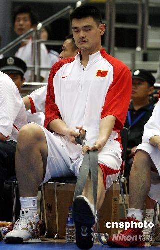 圖為姚明在比賽間訓練負傷的左腳。中新社發(fā) 任晨鳴 攝