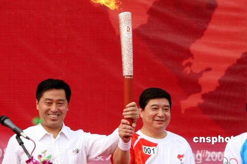 7月18日,北京奧運火炬在遼寧鞍山傳遞,奧運會“六朝元老”、中國射擊隊總教練王義夫(右)擔任第一棒火炬手。 中新社發 周兆軍 攝