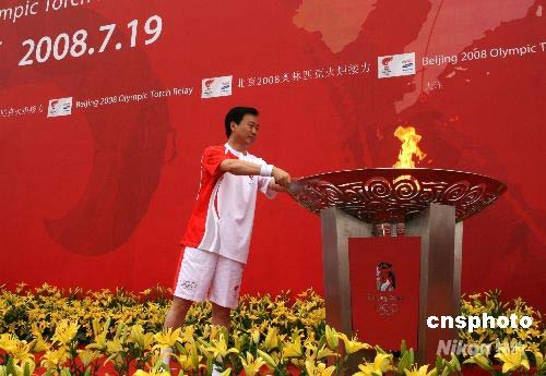 7月19日,隨著最后一棒火炬手、大連市市長夏德仁點燃圣火盆,北京奧運火炬圓滿結束了在大連的傳遞。 中新社發 周兆軍 攝