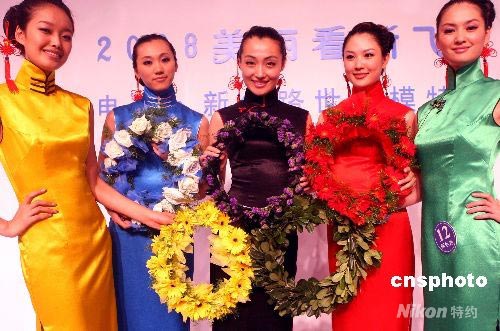 7月20日,2008美麗看新飛--新絲路世界模特大賽中國區(qū)總決賽在遼寧大連啤酒節(jié)上舉行,是次賽事經(jīng)過在中國5大城市巡演后的最后一站。15名中國賽區(qū)職業(yè)選手參加了5大城市巡演選拔,最后角逐出了10名最佳模特參加10月在北京舉行的新絲路世界模特大賽國際總決賽。圖為參賽模特選手身穿五色旗袍展示五環(huán)奧運風采。 中新社發(fā) 錢興強 攝