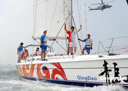 7月21日,青島浮山灣,奧運火炬在青島號帆船上傳遞。中新社發 廖攀 攝