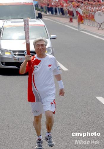 圖為神州飛船(1到5號(hào))總設(shè)計(jì)師戚發(fā)軔在青島傳遞奧運(yùn)火炬。 中新社發(fā) 廖攀 攝
