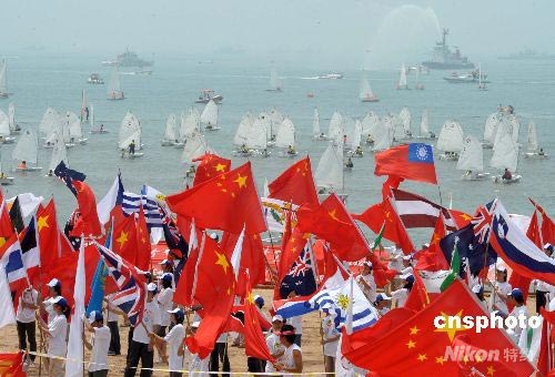 奧運(yùn)火炬在山東青島傳遞,在傳遞終點(diǎn)青島第一海水浴場,青島青年在帆船密布的海邊揮舞旗幟為北京奧運(yùn)加油。中新社發(fā) 廖攀 攝
